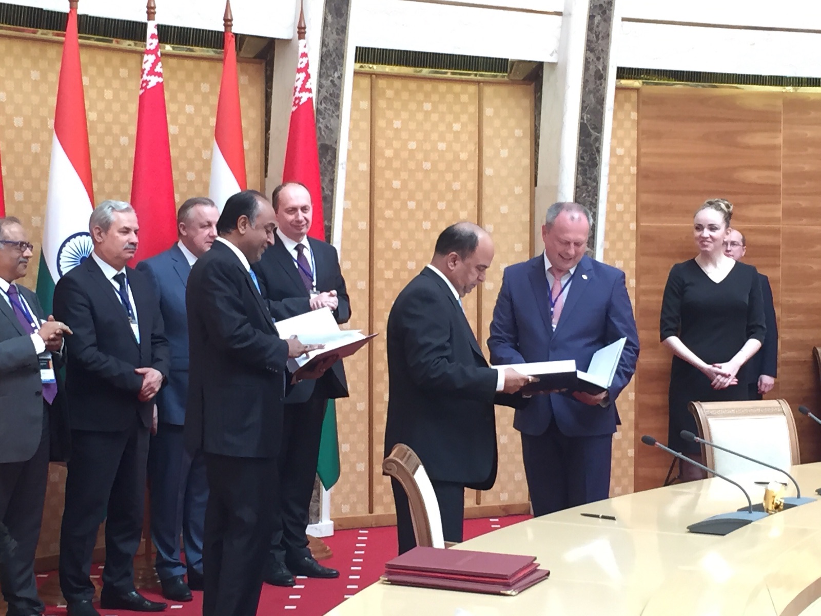 Tripartite Agreement being exchanged at Business Forum held in presence of President of India and President of Belarus in Minsk.