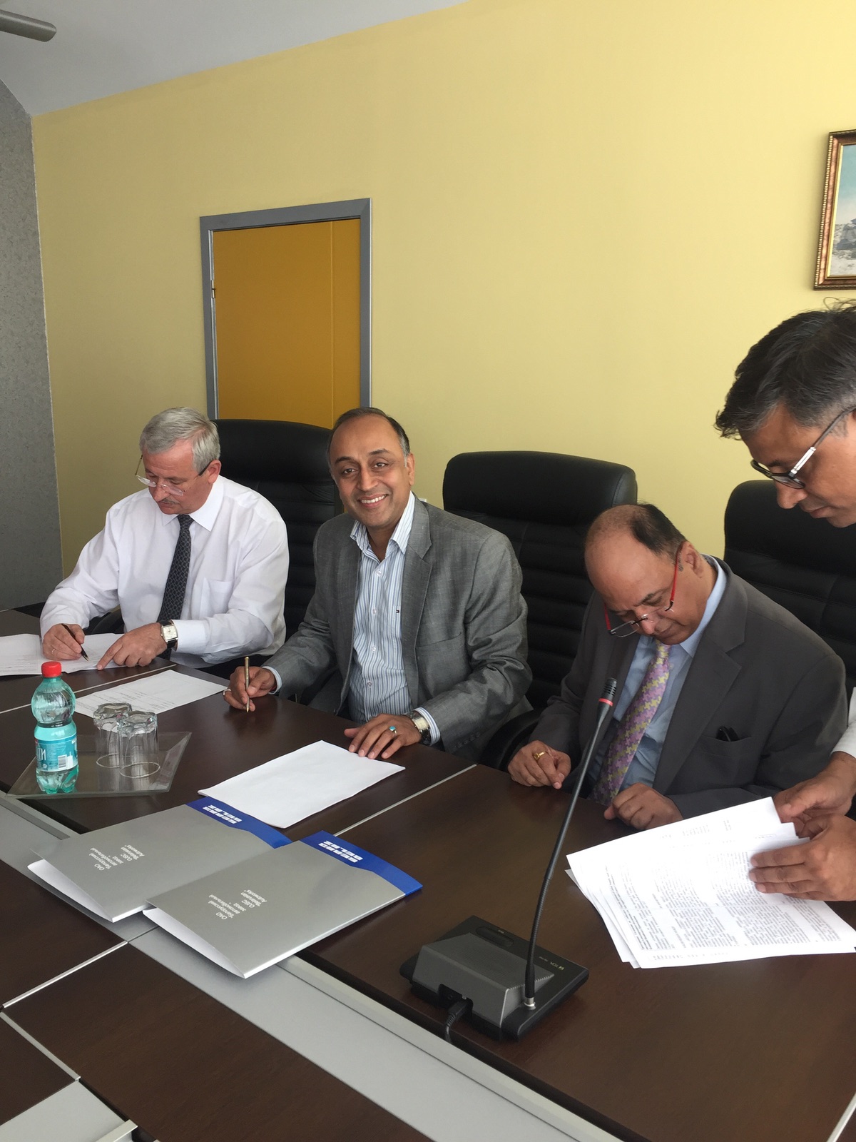 Tripartite Agreement being signed by OJSC Belaz DG-P.A.Parkhomchyk, CEO Belaz-Enrika Pvt Ltd-Samar Shakil and CEO Voltas Ltd-Pradeep Bakshi.